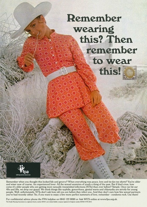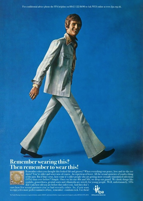 Here’s a simple campaign reminding adults jumping back into the pool (as in dating pool) that they’re just as susceptible to Sexually Transmitted Infections (Brit for STDs) like syphilis, genital warts and chlamydia as young people. Though the outfits in the ads feel like they’d put the audience a bit older than their stated 40’s and 50’s target, we won’t quibble over a decade.